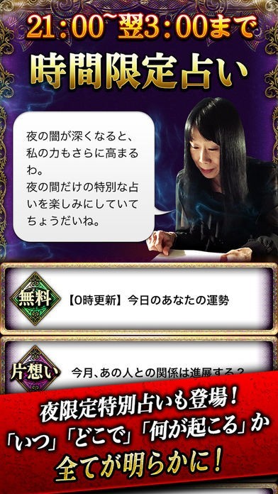 夜9時から深夜3時の間だけ、通常の占いとは違う不思議な占いが出現します。いつ、どこで、何が起こるのか。曖昧なごまかしは一切なし。この占いでは全てが明らかになります。