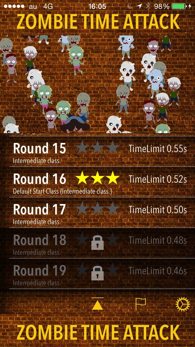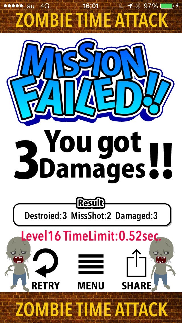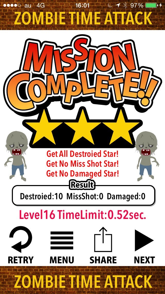 "ゾンビタイムアタック"は、早いスピードで襲いくるゾンビをタップで銃撃し、撃退していくゲームとなっています。ゾンビが出現してから到達するまでの時間が非常に短く、最高難度になるとわずか0.01秒となっています。ゾンビは3つの場所から出現し、 1ステージで10体出現します。ゾンビを制限時間内に8体以上撃退すればクリアとなります。しかし、3回以上攻撃をうけてしまうとその時点でゲームオーバーとなってしまいます。1プレイ数秒程度と気軽に楽しめますが、いかに反射神経を研ぎ澄まして、3箇所から出現するゾンビを銃撃できるかがポイントとなっています。動体視力と反射神経の限界に挑みたい方に最適です。