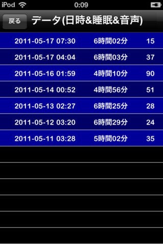 目覚ましをスタートさせた日時と、睡眠時間及び