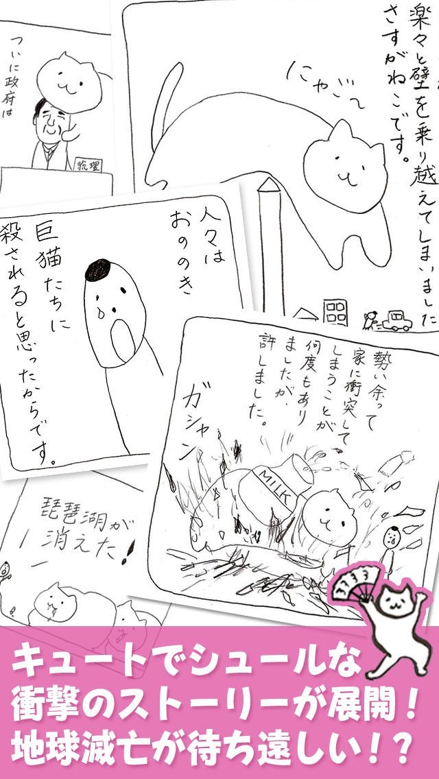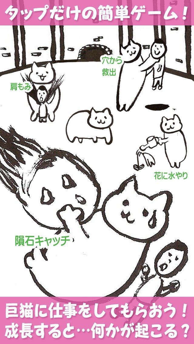 進撃の巨猫 〜地球滅亡までの10ヶ月〜はネコが様々な仕事をこなし、ネコが段々と巨大化していき、最終的に地球滅亡まで大きくなるというシュールなストーリーが楽しめるゲームです。
