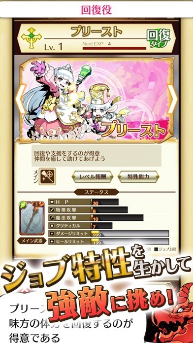 近距離攻撃最大火力のファイター、敵の攻撃を一手に引き受ける守りのナイト、仲間を癒すヒーラーなど様々なジョブがあります。