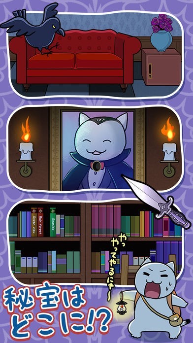 このゲームは、主人公の白ネコと一緒に恐怖の館から脱出するゲームです。「秘宝を探しに行って帰ってきた猫はいない」と言われる館から、果たして無事に戻ってこれるでしょうか?