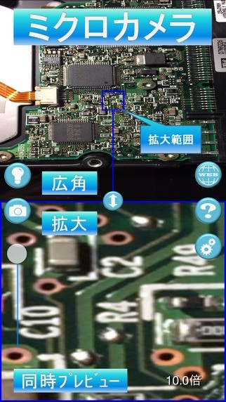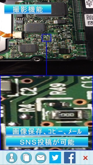 精密機械を扱う技術者の方は内部の部品が細かく、はっきり見るために肉眼だと目を凝らす必要があります。この「ミクロカメラ」はカメラ機能を使ったアプリで最大10倍まで拡大できるため、細かな部品でも鮮明に見ることができます。特徴であるスプリット機能は画面上半分に拡大図を写しながら、画面下半分では広角画像を確認できるためどこを写しているのか迷うことがありません。撮った画像はメールに貼付して送信することもできるため、技術者同士で教え合うときにも共有できます。