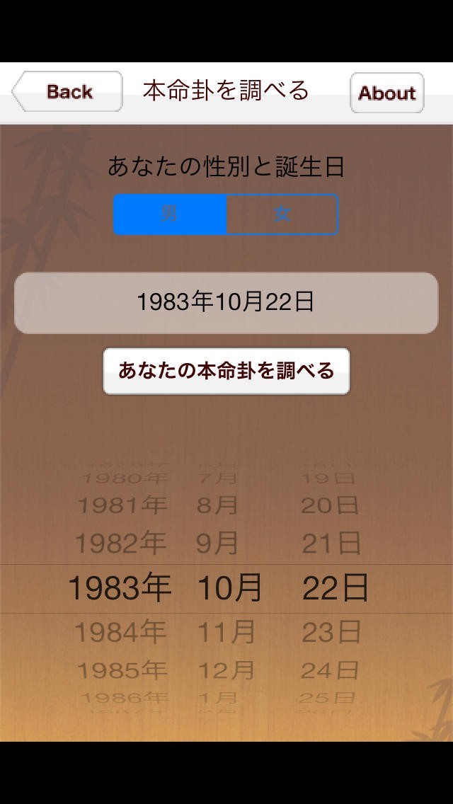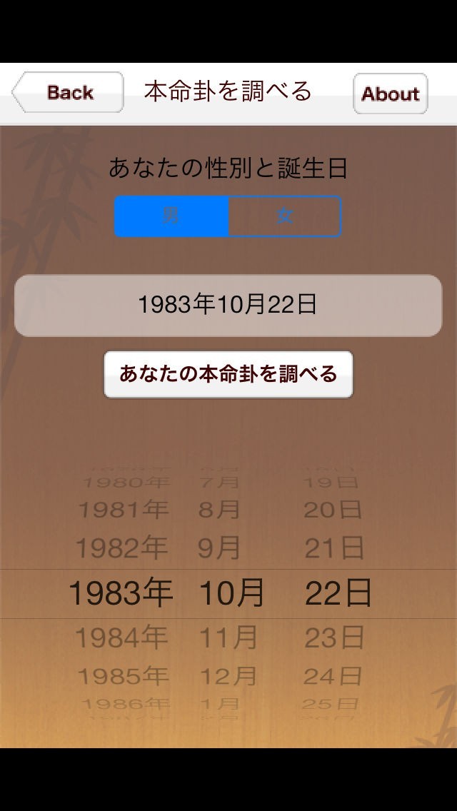 まず、あなたの誕生日と性別を入力します。それに応じたあなたの本命卦が表示されます。