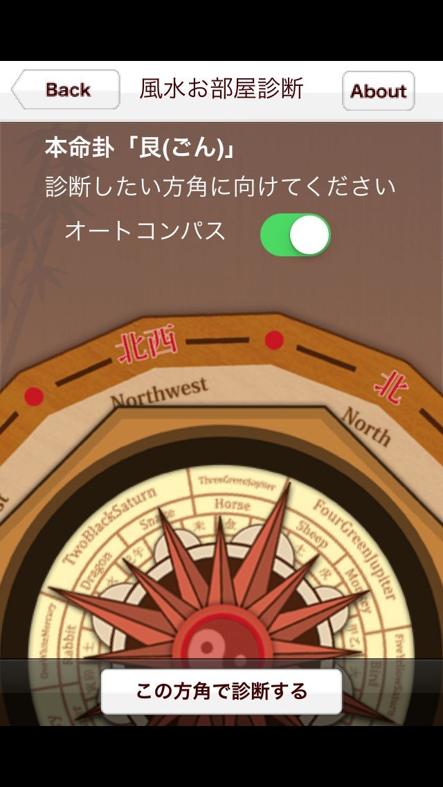 部屋の中心に立ち、iPhoneを調べたい方角に向けると、自動的に方角が読み込まれますので、調べたい方角でボタンをタップしてください。