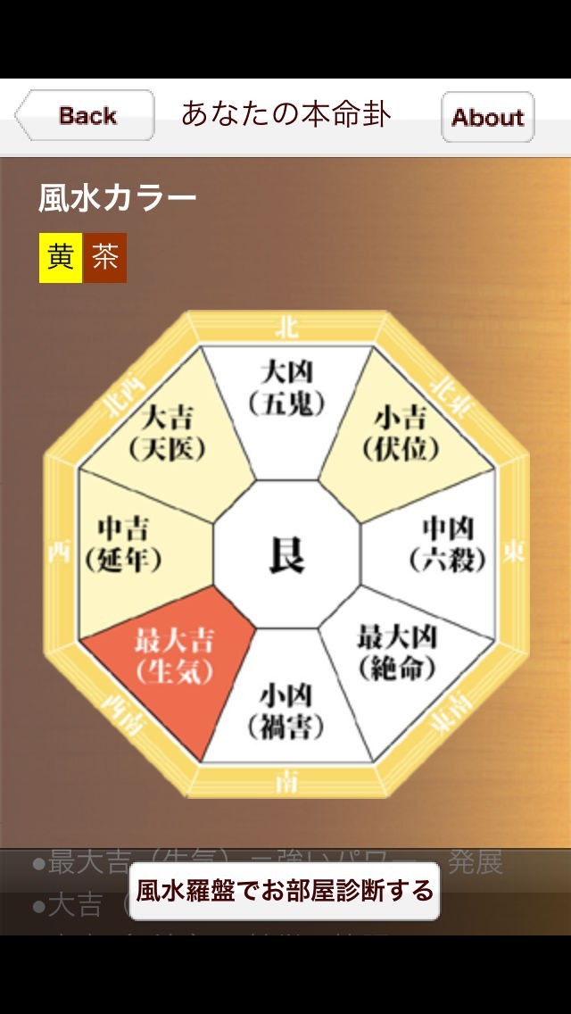 次に、iPhoneのコンパス機能(iPod touchでは手動コンパス)を使用した「風水羅盤」で、あなたの本命卦に応じた良い方角・悪い方角を調べましょう。