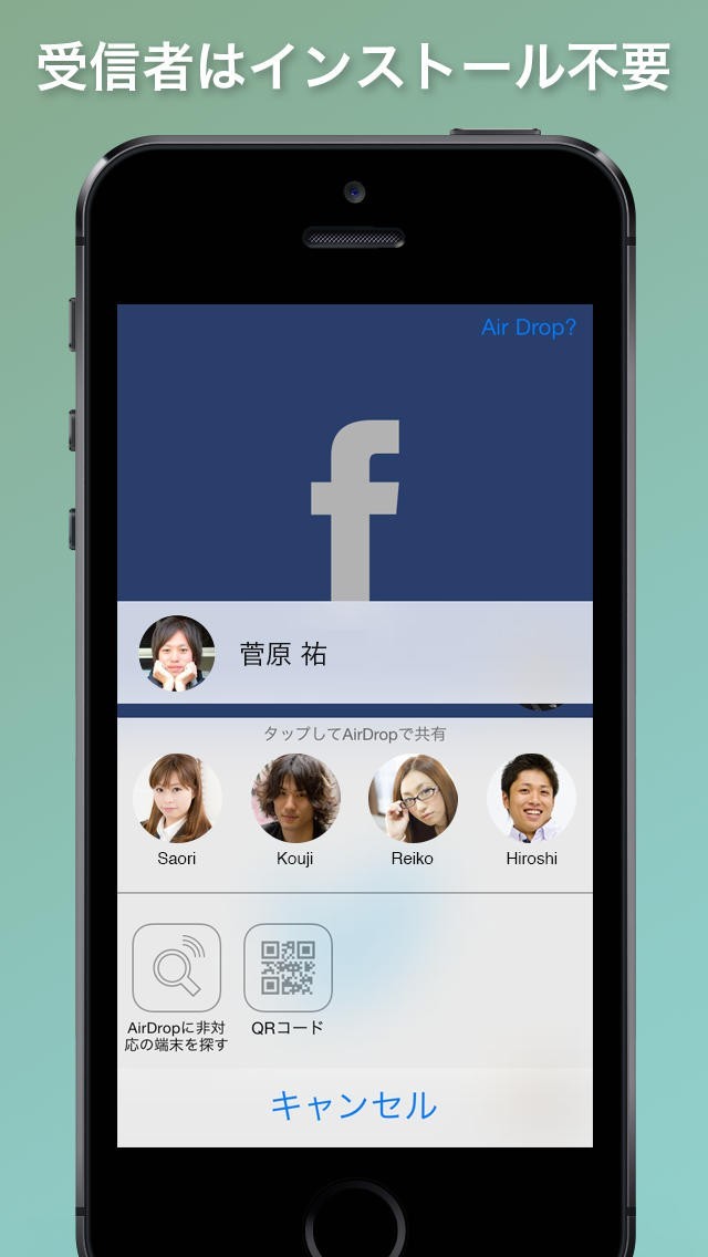 同じ場所にいる人に対してFacebookの友達申請やTwitterアカウントのフォロー、アプリや音楽の共有ができます。 その場にいる相手なのに、わざわざ名前を検索して友達申請、という手間が不要になり効率的です。また検索しても同姓同名が多くヒットして、なかなか相手が探せない、ということも無くなり便利です。 さらに、お薦めしたいiTunesストアの音楽やアプリをその場ですぐに複数人で共有して楽しむこともできます。 受信者は「AccDrop」をインストールしておく必要はなく、iOS7以降標準搭載のAir Dropを活用します。Air Dropに対応していない場合は、相手も「AccDrop」をインストールするか、QRコードを読み取ることで対応が可能となっています。