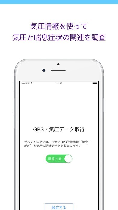 ぜんそくログは、喘息の実態調査をすることで治療の向上に貢献して臨床研究に役立つアプリです。日々の喘息管理状況を確認しながら、気圧の変化と喘息についての調査をします。喘息は様々な原因で誘発されますが、気圧も関係していると考えられています。 喘息日誌として使用できる機能が付いています。喘息のコントロール状況がわかり、体調管理しやすくなります。 20歳~80歳までの気管支喘息の方が対象になり、自分自身でぜんそくログへ入力していきます。 iPhone6には気圧計の機能が組み込まれます。気圧情報とGPS位置情報を収集して、気圧とぜんそく症状の関連の調査に役立ちます。