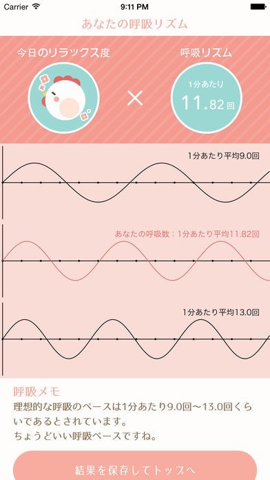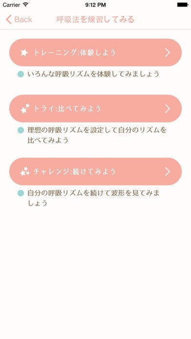 目指したい理想の呼吸リズムを1分間に9~13回の中から選びます。その後、選んだ時間(1分、3分、5分)だけ あなたの呼吸を計測します。息を吐く間は指で画面をタッチし、息を吸う間は指を画面から離します。終わったら、目標として選んだ呼吸とあなたの実際の呼吸を比べた結果を見ることができます。