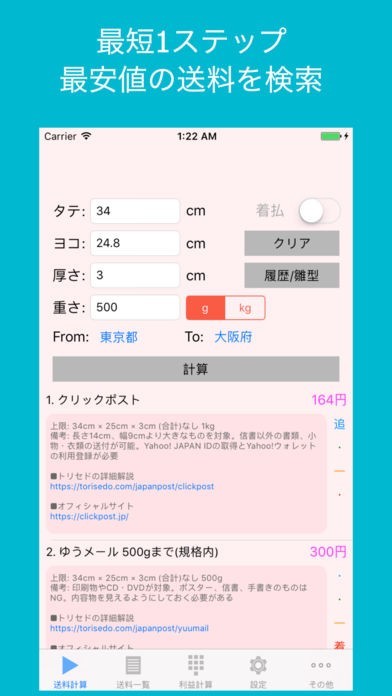 実際にモノを送る段階になってから送料で慌ててしまうことがないように事前計算ができると便利です。本アプリでは送りたいものの大きさや重さを入力することで料金の計算が行えます。