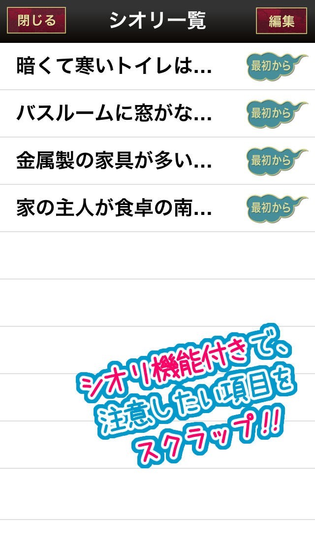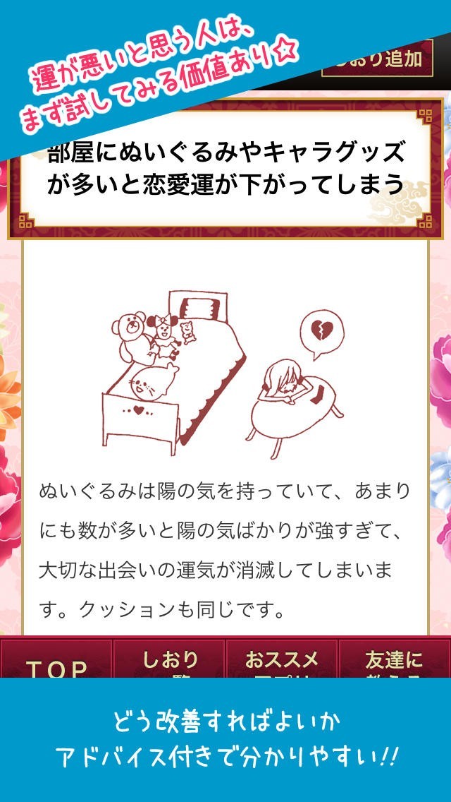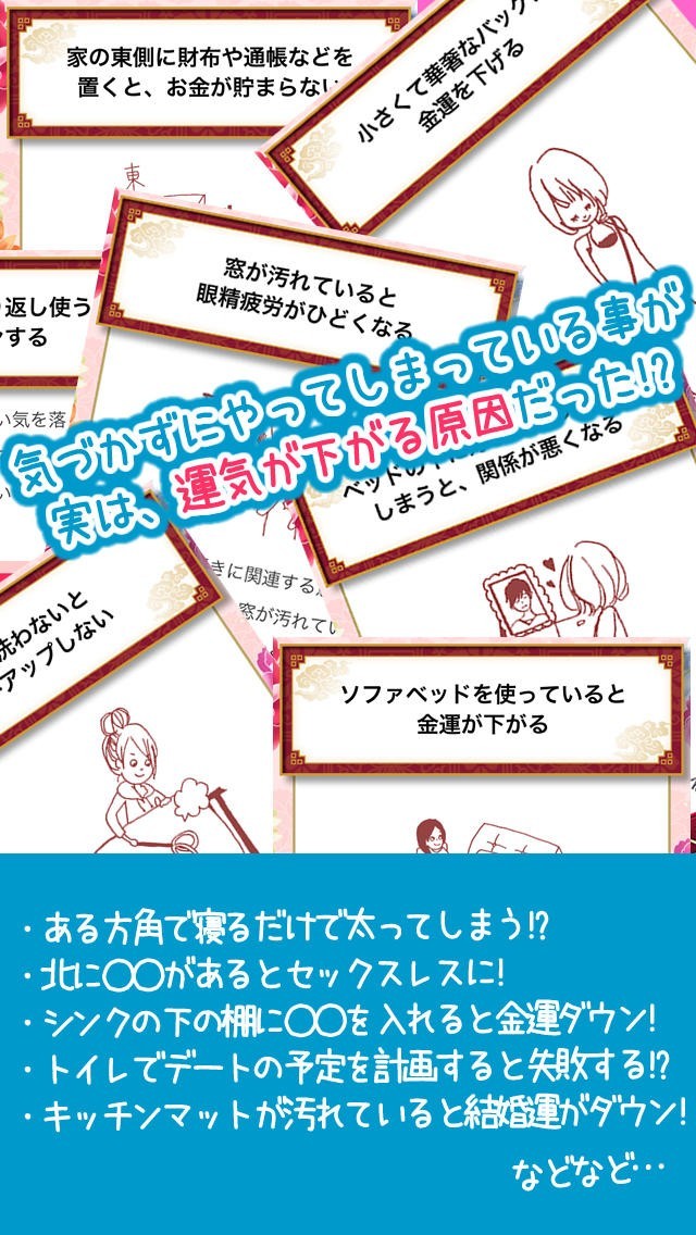 このアプリを使えば風水を活かして、恋愛運や金運をアップすることができるので、風水に興味を持っている方がターゲットとなります。 具体的な内容は「窓が汚れていると眼精疲労がひどくなる」、「部屋にぬいぐるみやキャラグッズが多いと恋愛運が下がってしまう」などのものなのですぐに改善することができるので、試しに変えてみるという使い方ができます。 また内容でさらにはイラストまでついているので、誰にでも解りやすいです。 また、その中で特に気になるものがあれば、「シオリ機能」を活用することによって、保存しておくことができるのであとからまとめてチェックするという使い方ができます。 それ以外にもお友達に教えることもできるので、お友達と同じ行動をしてみて効果があったかを確認し合うという使い方ができます。