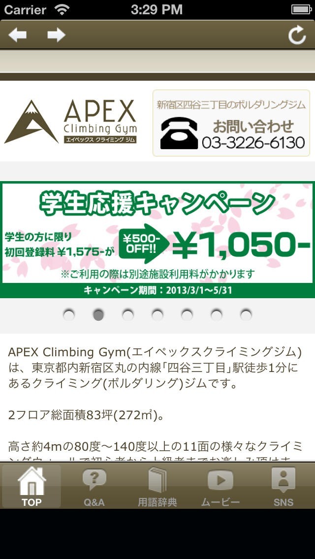 "初心者のためのクライミング辞典"は、新宿にあるボルダリングジム"APEX"の公式アプリで、APEXに通う方はもちろん、ボルダリングを始めたい方や初心者の方に最適なアプリです。APEXの営業時間や学生向けのお得な情報に加え、ボルダリングを始める際に必要な服装から用語知識までを分かりやすく学ぶ事ができます。ボルダリングをする上で欠かせない専門用語を収録した"用語辞典"を覚えながら、"ムービー"に収録された実践動画を観ることによって、イメージを掴みながらより効果的に知識を身につける事ができます。また、ツイッター機能を備えており、投稿を通して同じ趣味をもつボルダリング仲間を増やしたいと言った方にも最適です。
