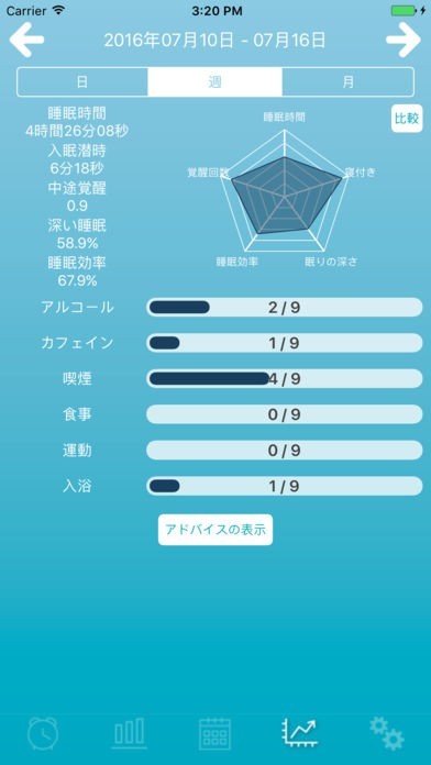 ・睡眠サイクルがグラフなどで表示され、過去のデータと比較が可能