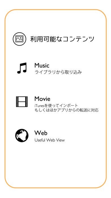音楽、動画の再生、ブラウザでのサイト閲覧ができるようになっています。メニューにあるミュージック、ムービーを利用するには、端末やパソコンからアプリ内へファイルをアップロードすることで視聴可能になります。