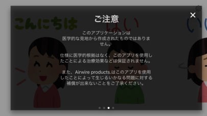 また、Airwire products.はこのアプリを使用したことによって生じるいかなる問題に対する補償が出来ないことをご了承ください。