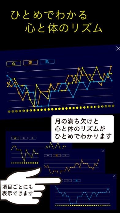iPhoneを横に傾けるだけで、月齢ごとの心と体のリズムがグラフで表示されます。