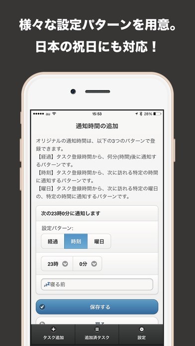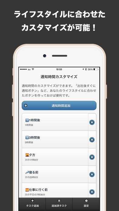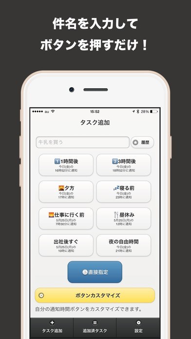 「1時間後」「出社前」といった、“時間プリセット方式”だから、通常のリマインダアプリのように通知時間を毎回入力しなくてOK!