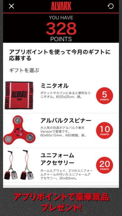 試合結果を予想したりするクイズでポイントを貯めることができます。貯まったポイントで、ここでしか手に入らない限定グッズが入手できます。ホームゲームでポイント5倍などのサービスも実施されています。