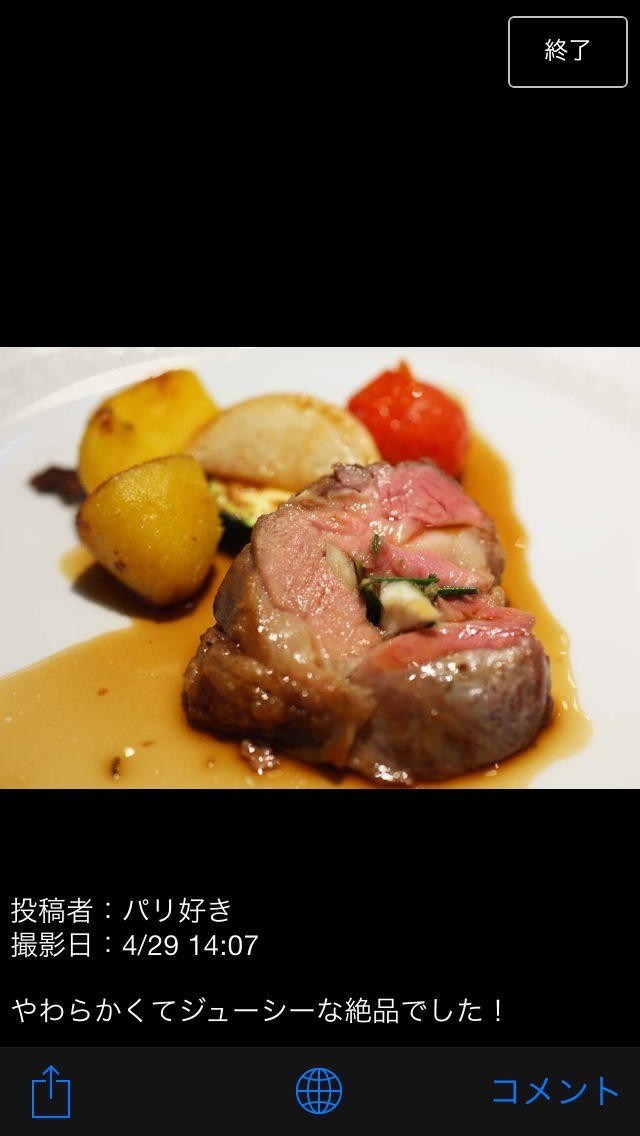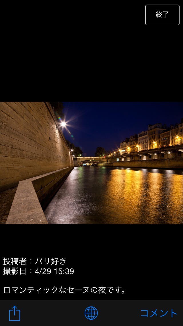 フランス旅にお役立ちな写真投稿アプリ「みんなの旅フォト フランス篇」には、ユーザー同士で情報を共有するための機能が充実しています。投稿機能からはフランスで撮影した写真を何でも投稿可能。ディナーで食べた美味しい料理や旅先の景色、現地で見つけた素敵なお店など、その場でしか撮影できない写真をどんどん投稿してみましょう。投稿に位置情報を付属させれば、イチオシのお店の場所も手軽に紹介できるのがポイントです。皆の自慢の投稿の中から、これはと思える1枚を発見したら、応援のコメントをつけてみてはいかがでしょうか。また、マイページ機能では投稿済みの写真の管理が行える他、写真一覧をアルバムとしても利用できるようになっています。