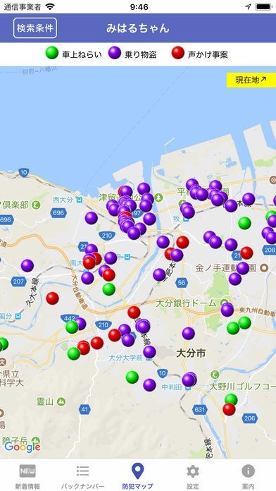 防犯マップは、地図で発生した場所がわかり付近で起きた事件を見れる
