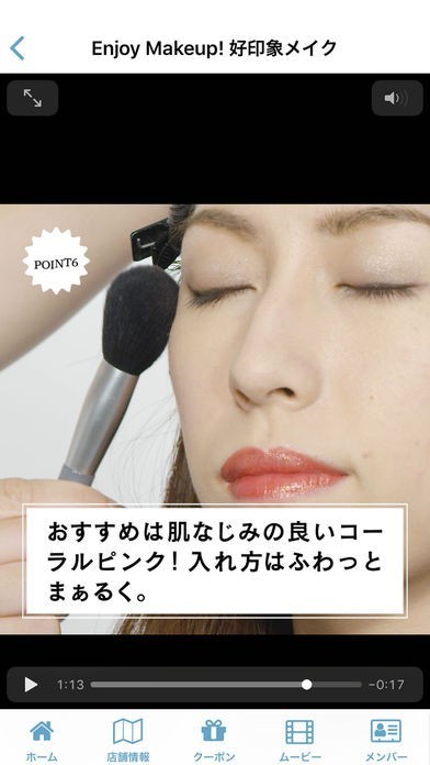 マップを開く事によって、地図上にショップの場所や詳細が分かります。また、アプリにはプロのメイクアップアーティストによるメイク講座のムービーを見ることができます。