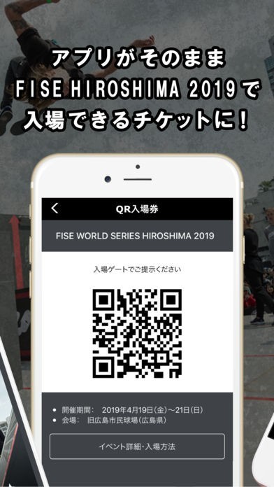 アプリがそのまま入場チケットになります。入場ゲートでQRコードを提示すると、広島で行われる日本最大のアーバンスポーツイベントへ参加することができます。アプリのユーザーは必ず利用したいチケットです。