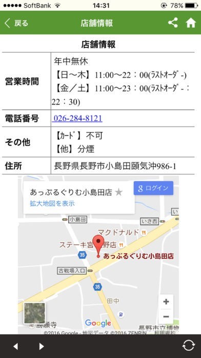 店舗情報ボタンをタップすると、気になっているお店や現在地から近いお店を調べることができます。あらかじめ営業時間やメニューをチェックすることができるので下調べもばっちりです。