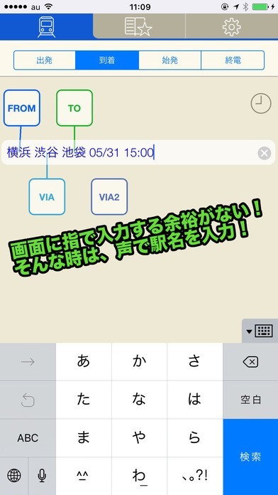 1行入力により、出発駅、経由駅、到着駅、日時を入力