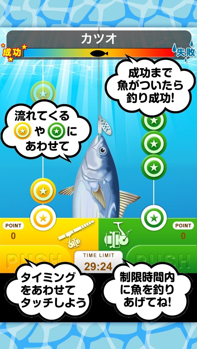 リズムにあわせて画面をタッチする、簡単な操作で遊ぶことができます。釣った魚は図鑑に登録されるので、どんどん釣ってたくさんの種類の魚たちをコレクションしましょう。大物を釣り上げると高い賞金をもらえます。