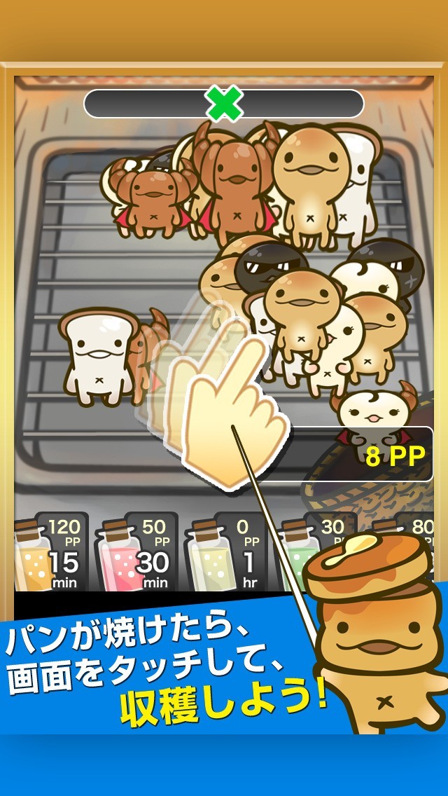 時間が経ってしまうとパンが焦げるので、時々画面を見てパンが焼けたらすぐにタップして集めていく