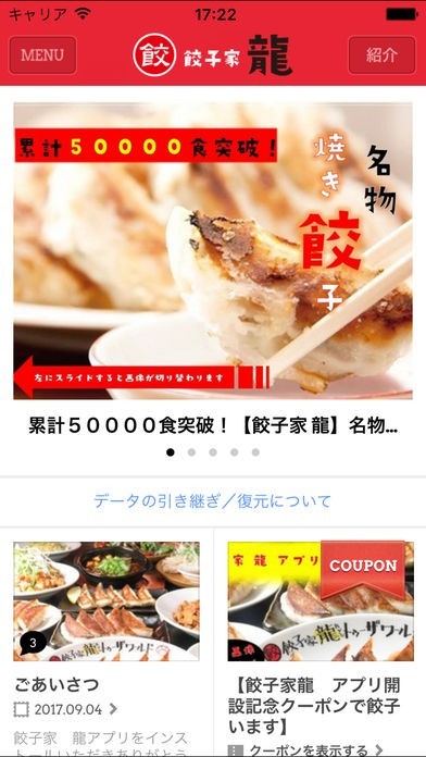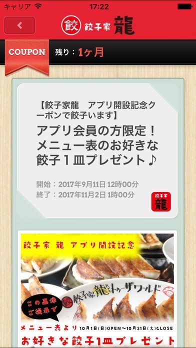 クーポンは餃子1皿無料など、餃子好きにうれしいサービスがある
