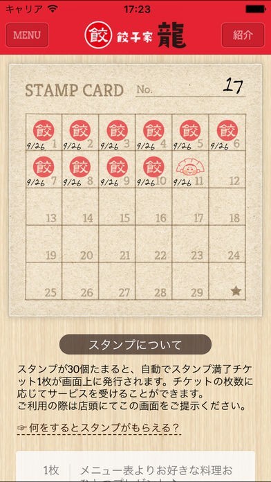 餃子家龍は、スタンプを貯めたり、限定情報やお得なサービスがある
