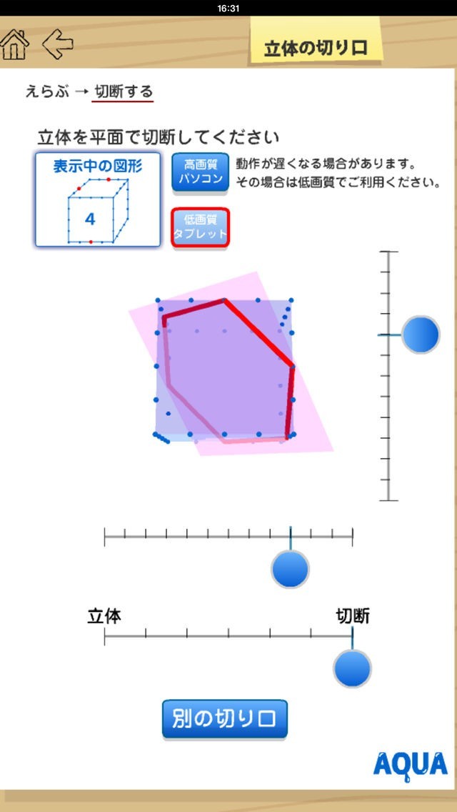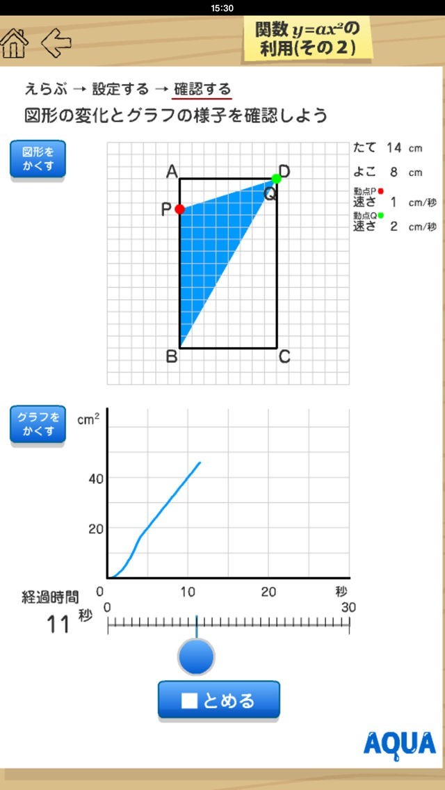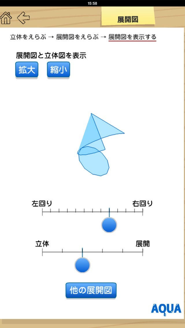 AQUAは、中学生で習う数学の学習を動きを通して理解していく学習方法です。数値入力機能では、決められた数字に固定されず、自由に数置を変化させることができます。実際に設定した値になるグラフの変化を確認することができるので、理解力が深まり目で確かめながら数学の学習ができます。イメージ描画機能では、立体をボタン操作で動かしていきます。展開図と立体図は、途中経過を見ることで変化していく過程が理解できるようになります。右回りや左回しで、見る方向を変化させて見れるので、立体図へのイメージが膨らんでいきます。数学は固定された数字で理解できても変化するとわかりにくくなります。自分で変化させて確認できるので、数学が理解できるようになり好きになれるきっかけになります。
