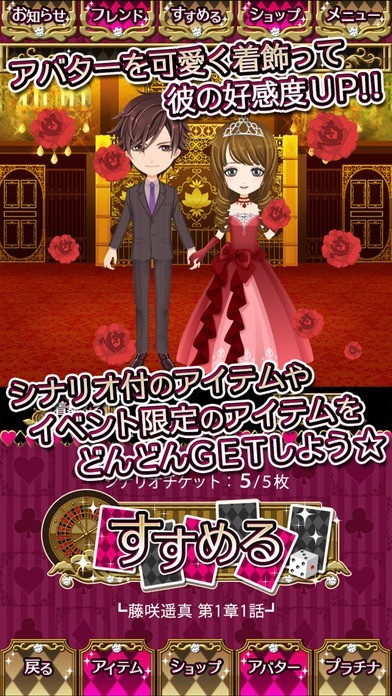 本作はシナリオとアバターの着せ替えを楽しみながら選択肢を選び、各種エンディングに辿り着く女性向け恋愛アドベンチャーアプリ(乙女ゲーム)です。