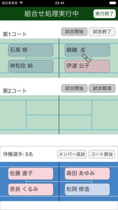 ・試合を開始すると青色のコートに次の組合せが自動表示されます。