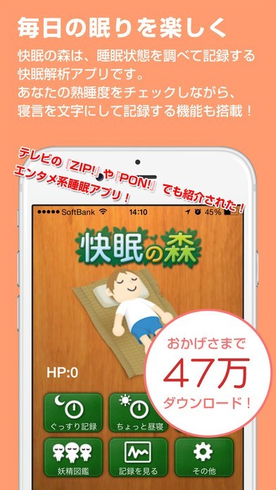 快眠の森〜寝言を解析します〜というアプリはいつも心地よい眠りができないという方に快眠の手伝いをしてれるアプリです。 その機能は快眠のサポートをしてくれる機能と睡眠時の情報を記録してくれる機能が備わっています。 またちょっとした遊び心でゲーム機能もあります。これらの機能を使って快眠を確保できるようにしてくれます。