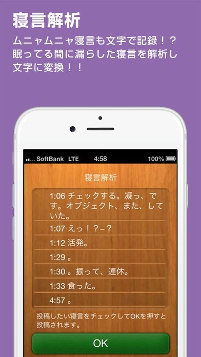 寝言を自動的に録音してテキストに変換してくれるので、無意識の間にどんな寝言を言っているか確認できる!