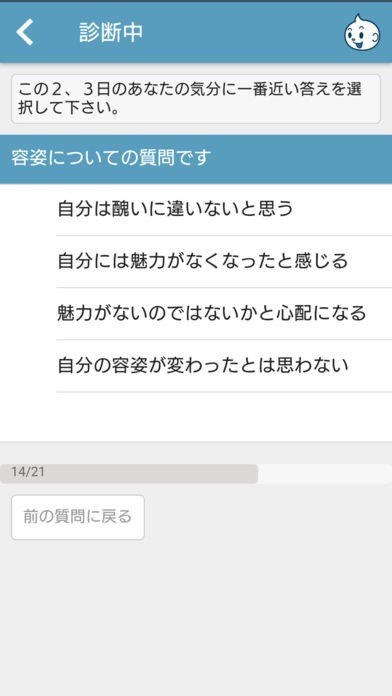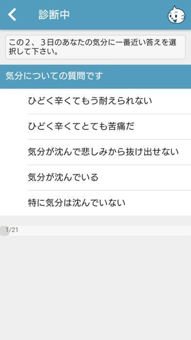 全21問の簡単な質問に答えるだけでメンタルヘルスの状態をチェックすることができるようになっていて、2分程度の時間でチェックできるのでちょっとした空き時間で利用できます。