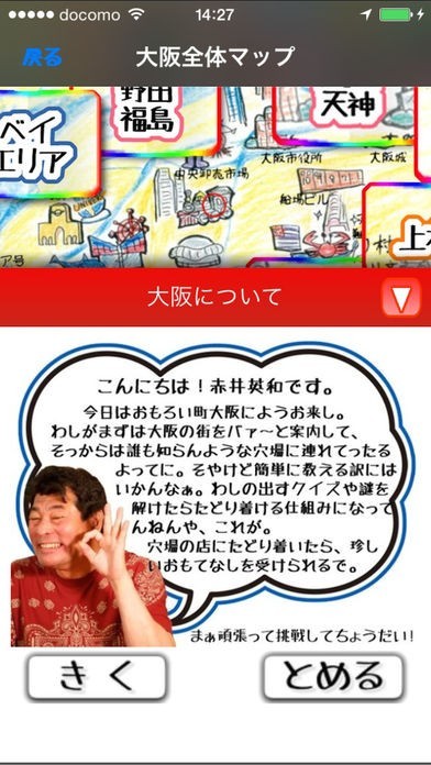 赤井秀和の肉声による大阪ガイドを聴きながら、おすすめの安くてうまい店を見つけることができます。GPS機能で店までナビしてくれるので、簡単に店まで行くことができます。