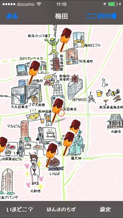 通常に地図である「ほんまのちず」と味のあるイラストが描かれた「イラスト地図」を切り替えることができます。目的地と違うところを歩いているとヒントをくれるので、きちんとたどり着けます。