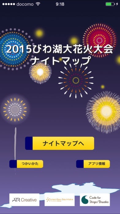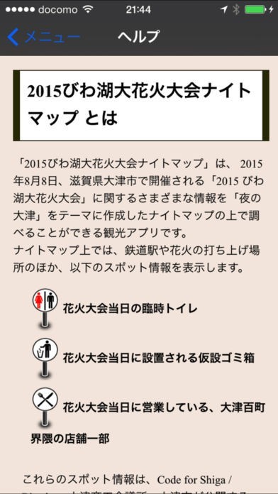 App Storeより引用「びわ湖大花火大会ナイトマップ」は、 2015年8月7日、滋賀県大津市にある琵琶湖で開催される「2015 びわ湖大花火大会」に関するさまざまな情報を「夜の大津」をテーマに作成したナイトマップの上で調べることができる観光アプリです。