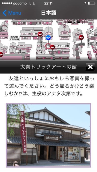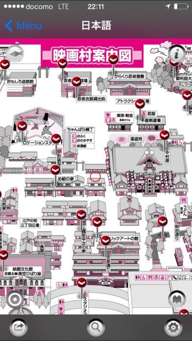 「ちずぶらりシリーズ」の東映太秦映画村版です。かわいい村内イラストマップに現在地を表示し、地図上のランドマークボタンをタッチすると施設の説明を見ながら映画村を見学することができます。