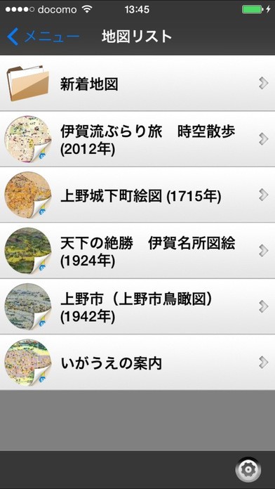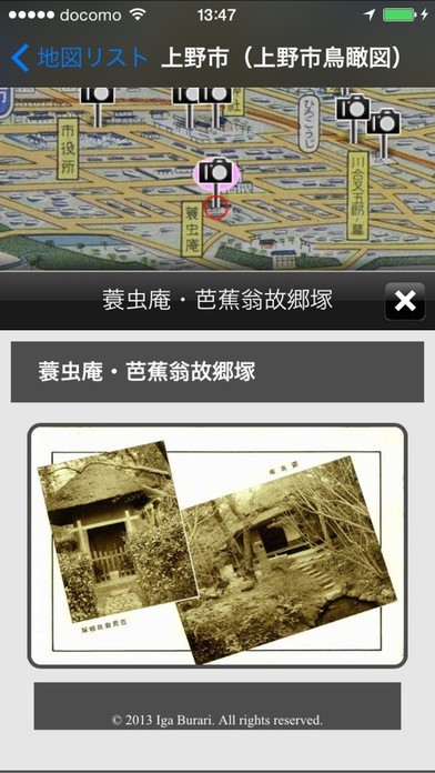 App Storeより引用「伊賀ぶらり」は、三重県伊賀地域の古地図やイラストガイドマップを、現在地情報付きで見ることができます。