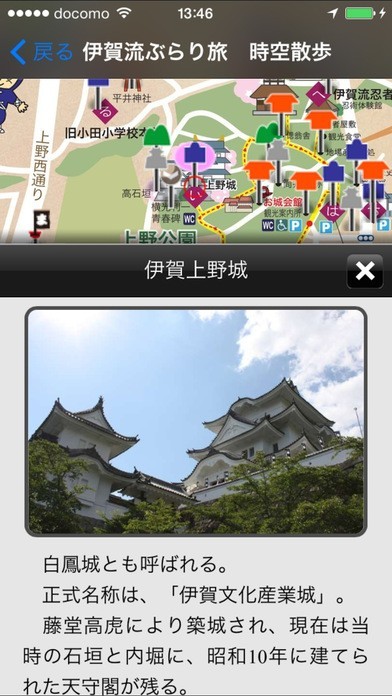 松尾芭蕉生誕の地、忍者の里として知られる伊賀は、伊賀上野城下町としても栄え、昔ながらの風情が残る町でもあります。「伊賀ぶらり」はこうした歴史や文化を、スマートフォンやタブレット端末等に表示される古地図やガイドマップを見比べながら散策できる、町歩き支援アプリです。