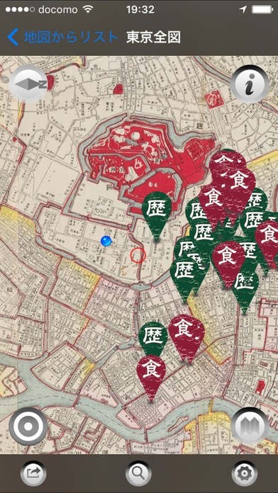* GPS情報に基づき現在地が移動し古地図の上を歩いているような感覚を味わえます。