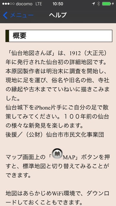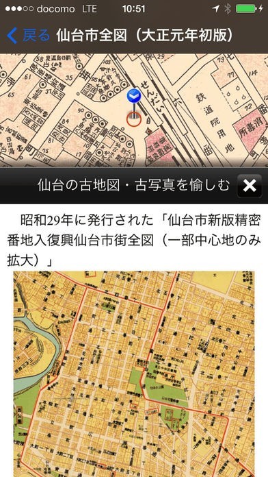仙台に旅行に行く方や仙台在住の方にオススメです。古地図閲覧機能を使って100年前の仙台を散歩でき歴史巡りをすることができます。これまでの仙台旅行では見れなかった新たな一面が発見できるかもしれません。