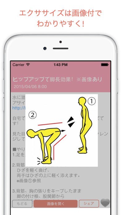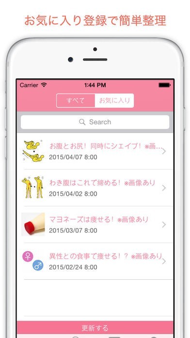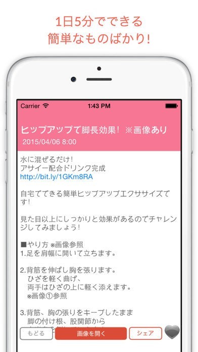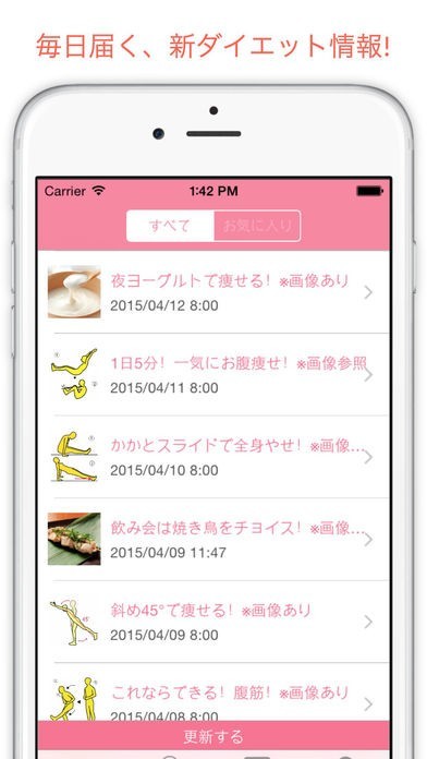 ダイエットに役立つ最新の情報が毎日配信されるダイエットサポートアプリが『みんなが痩せた!1日5分 誰でも続くダイエット』です。さまざまなダイエット情報が毎日配信されるので、ちょっとした空き時間により効率的なダイエット方法を探すことができるようになっています。このアプリで紹介しているダイエットエクササイズは5分間で行うことが出来るものばかりなので、時間がない人でも毎日継続することができるようになっています。お気に入り機能であとで読み直したいダイエット記事を保存しておいたり、身長や体重を入力してBMI値を計測することも可能になっています。