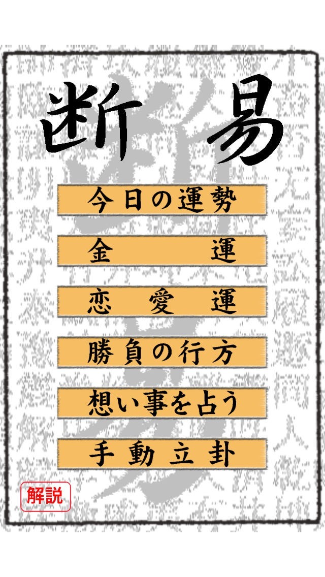 本格的な断易を行うためには、煩雑な干支や五行の関係や難解な用語を習得する必要がありますが、このアプリでは、どなたでも断易をおみくじ感覚で利用することができます。