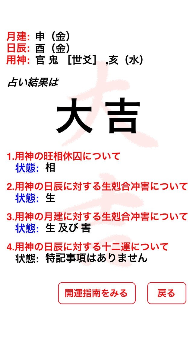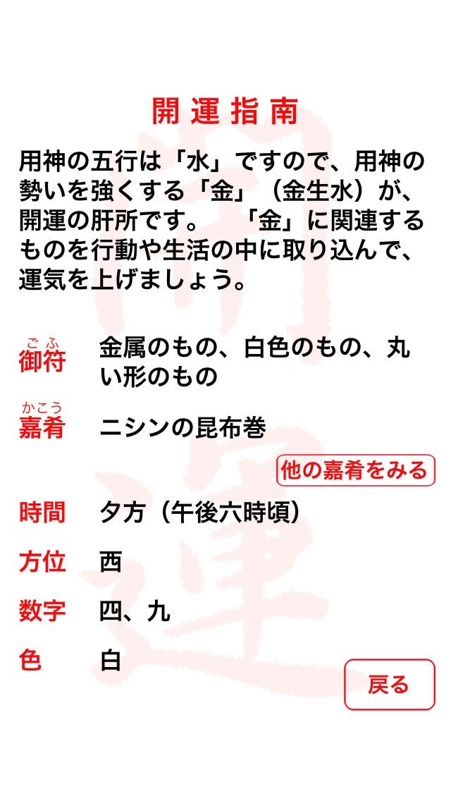 「開運指南をみる」をタッチすると、陰陽五行に基づく開運方法を表示します。