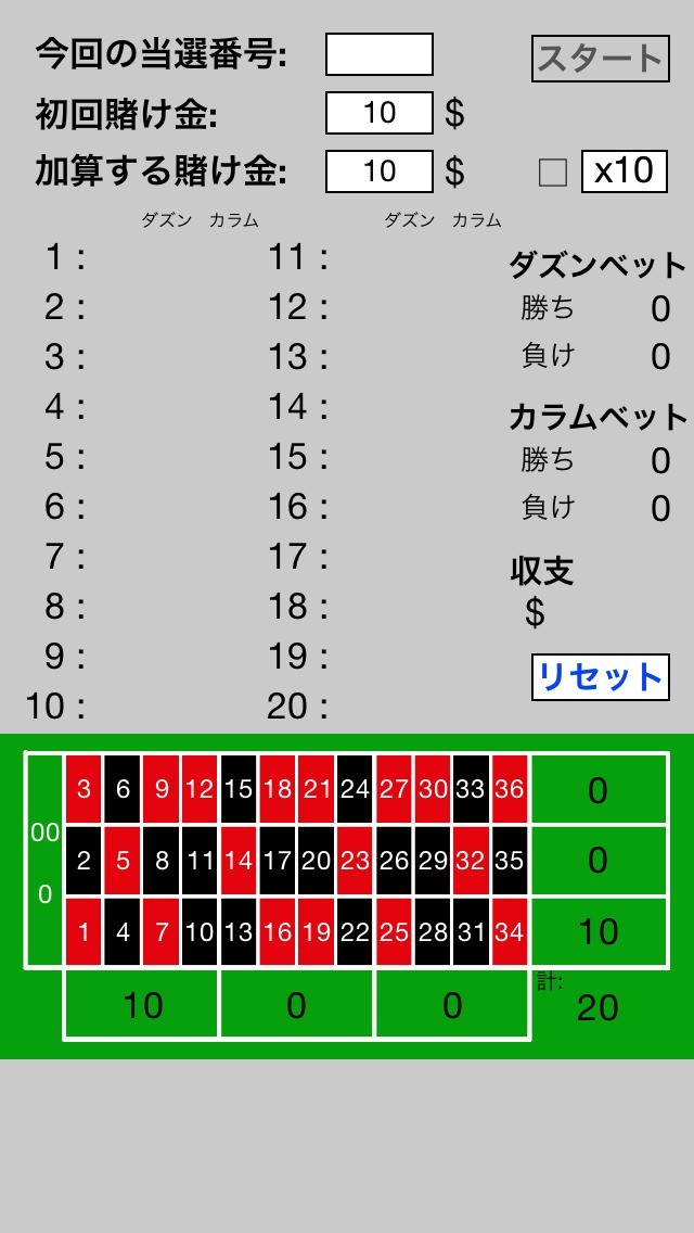 例)「加算する賭け金」を0に設定すると2回目以降に当選したとき収支はプラスマイナス0になります。10ドルに設定すると、収支は、20ドルになります。